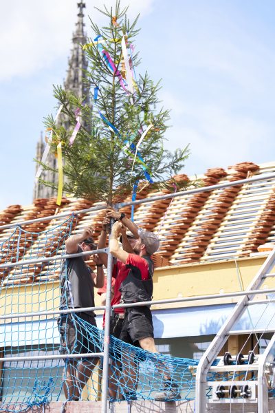 Bunte Bänder flattern im Wind und Scherben bringen Glück: Richtfest für ein neues Dach am Marktplatz